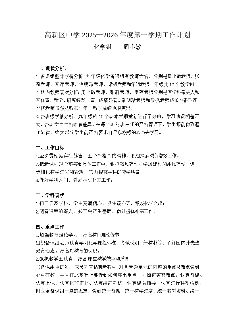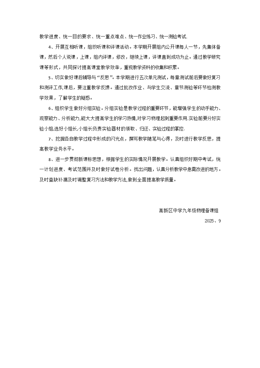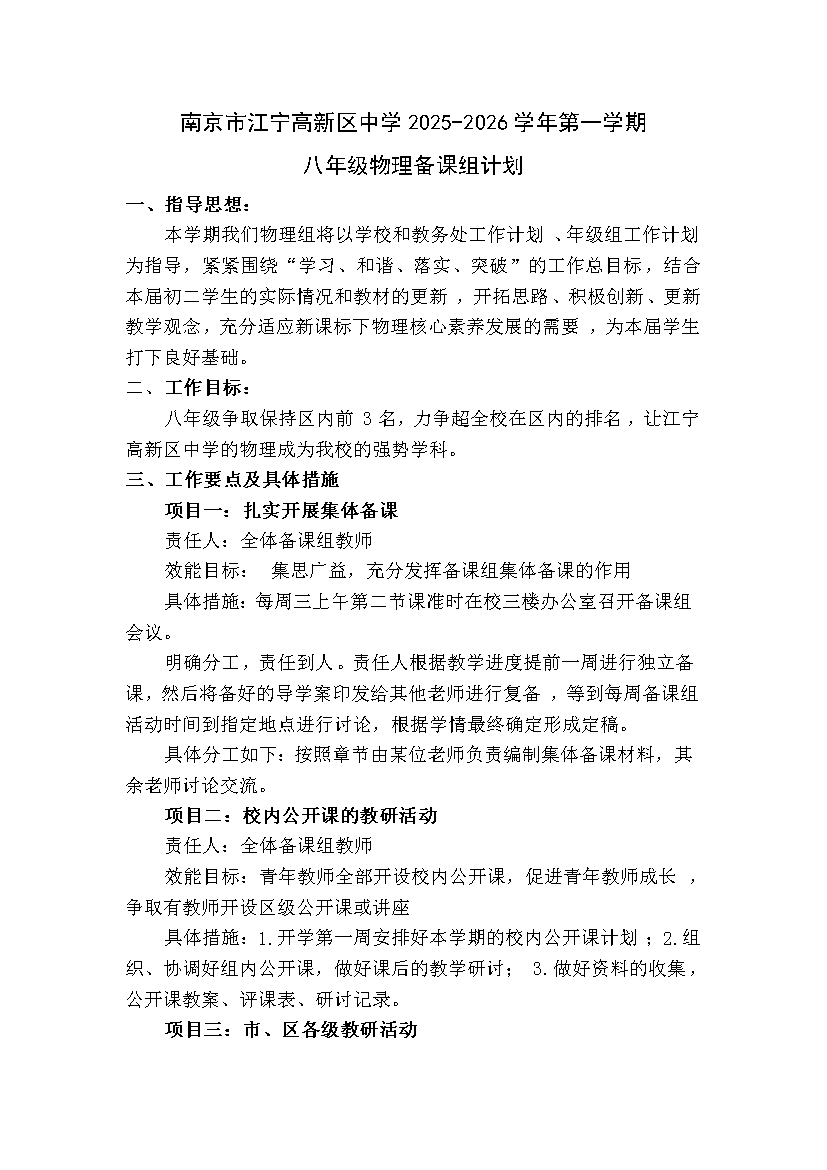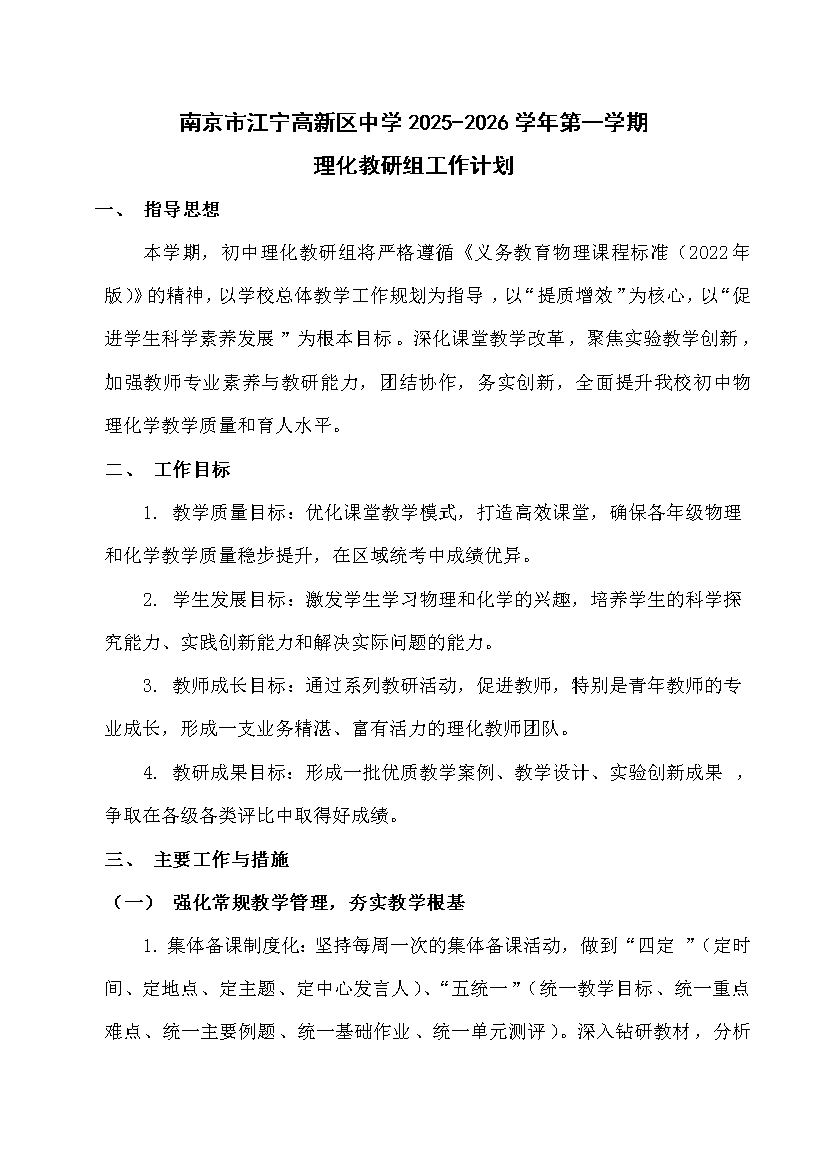 南京市江宁高新区中学2025-2026学年度第一学期理化教研组、备课组工作计划