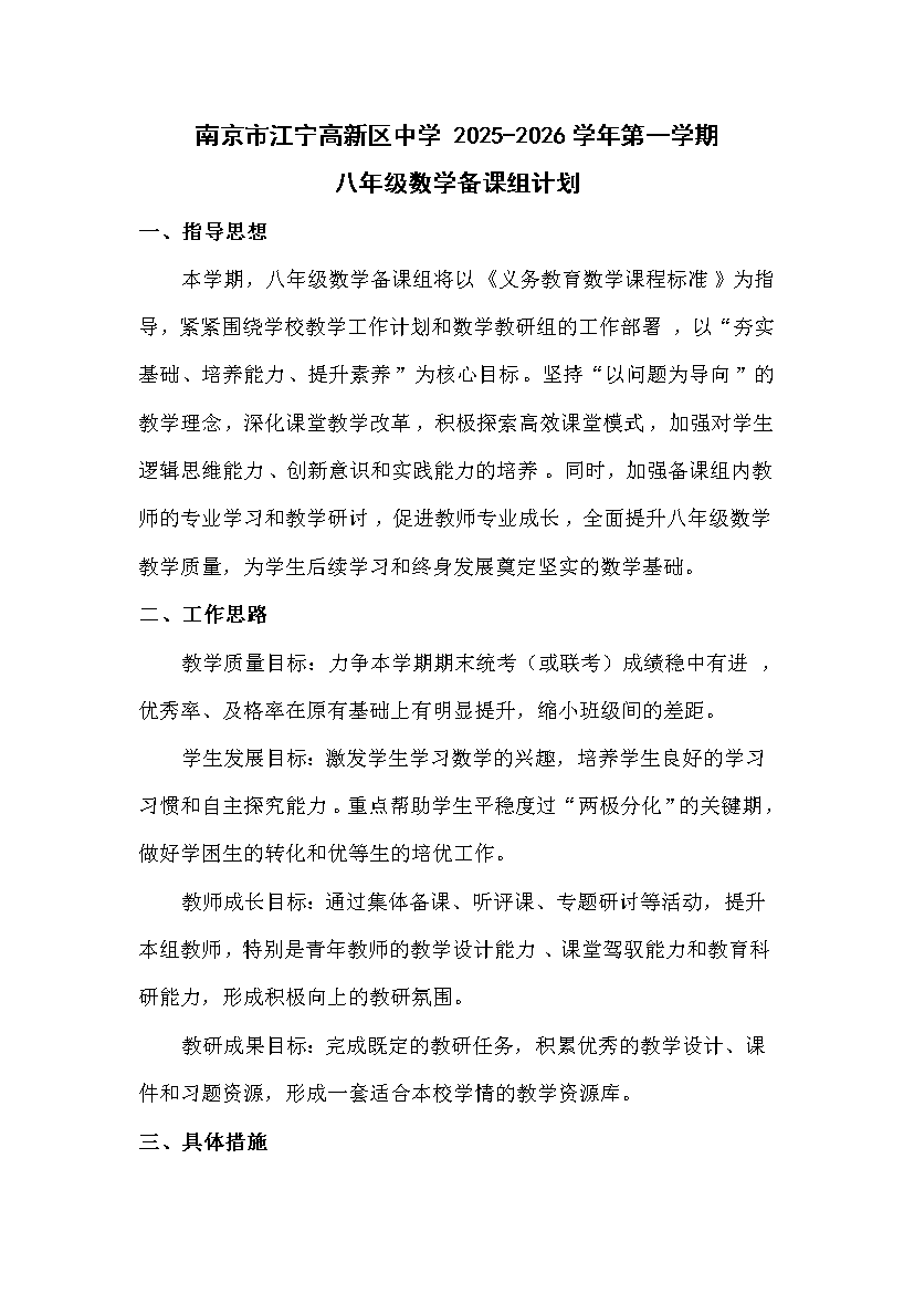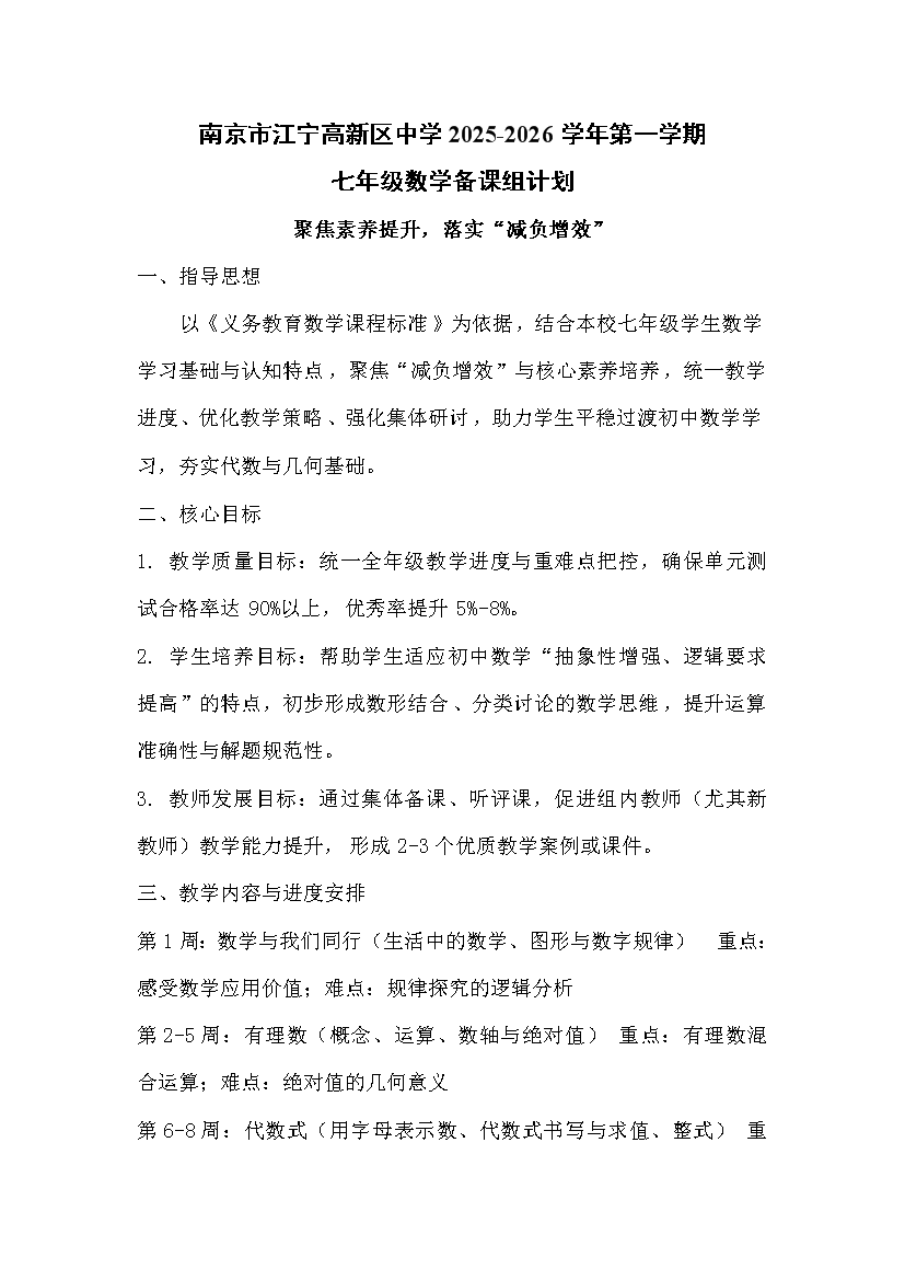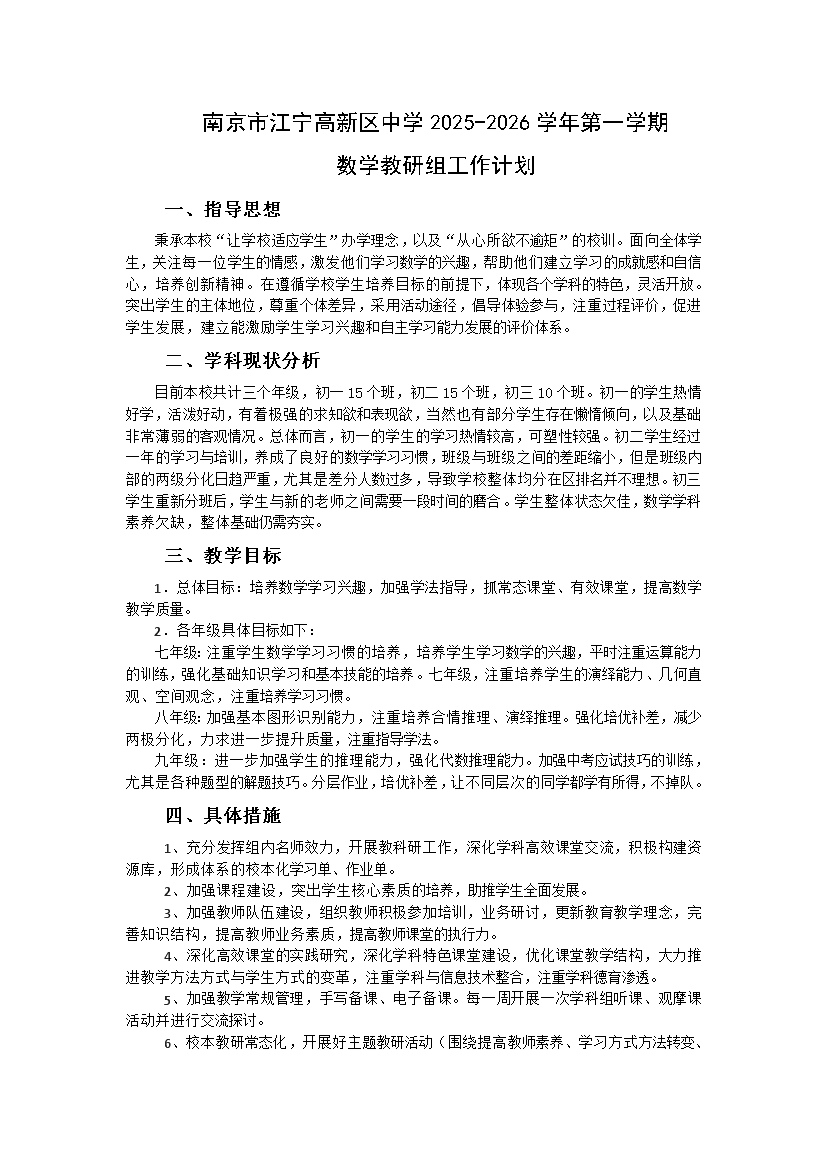 南京市江宁高新区中学2025-2026学年度第一学期数学教研组、备课组工作计划