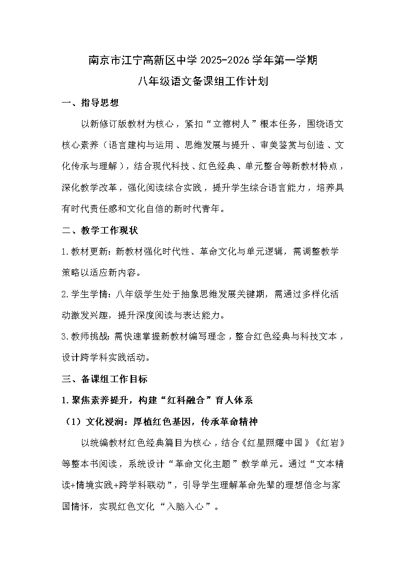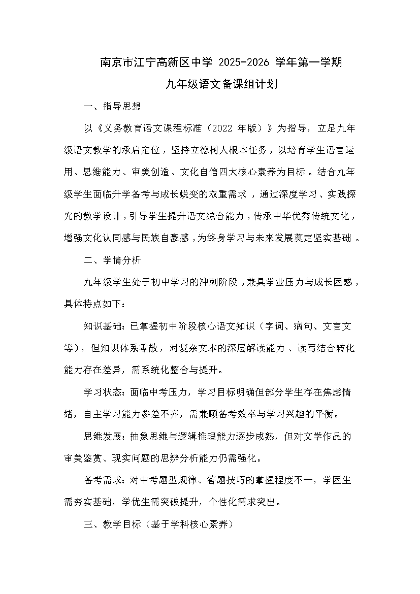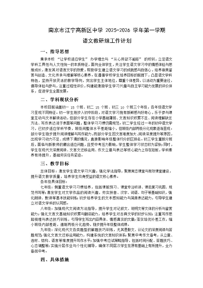 南京市江宁高新区中学2025-2026学年度第一学期语文教研组、备课组工作计划