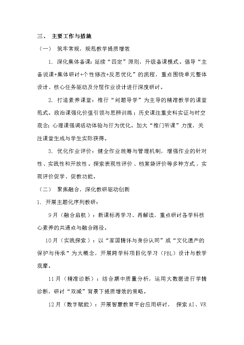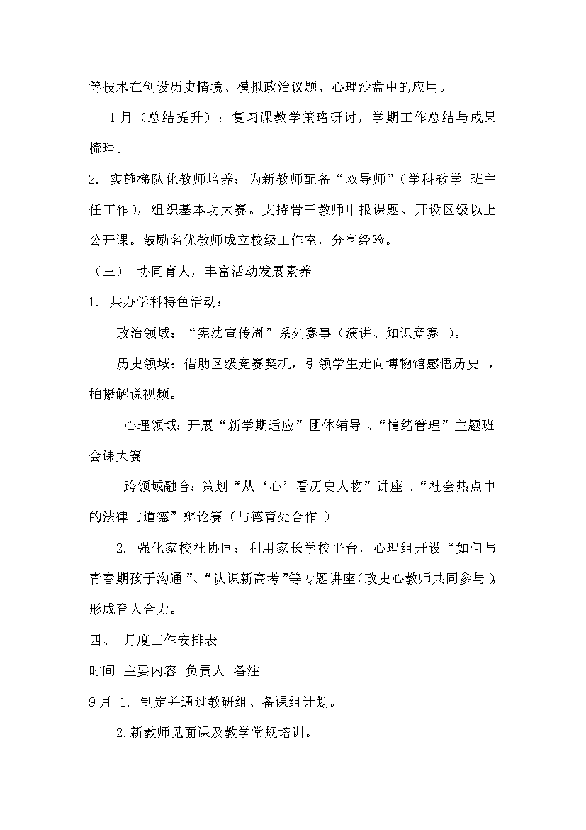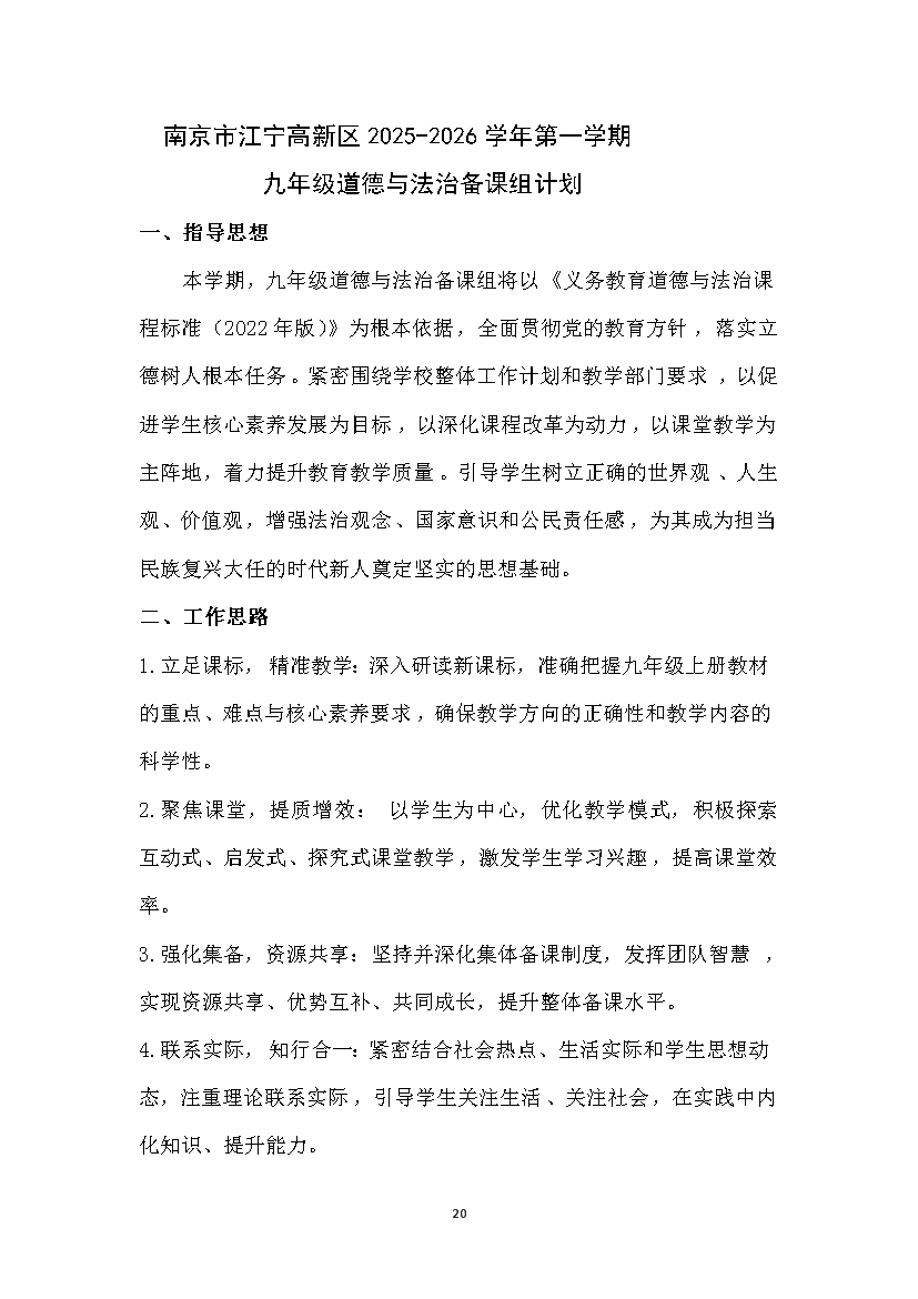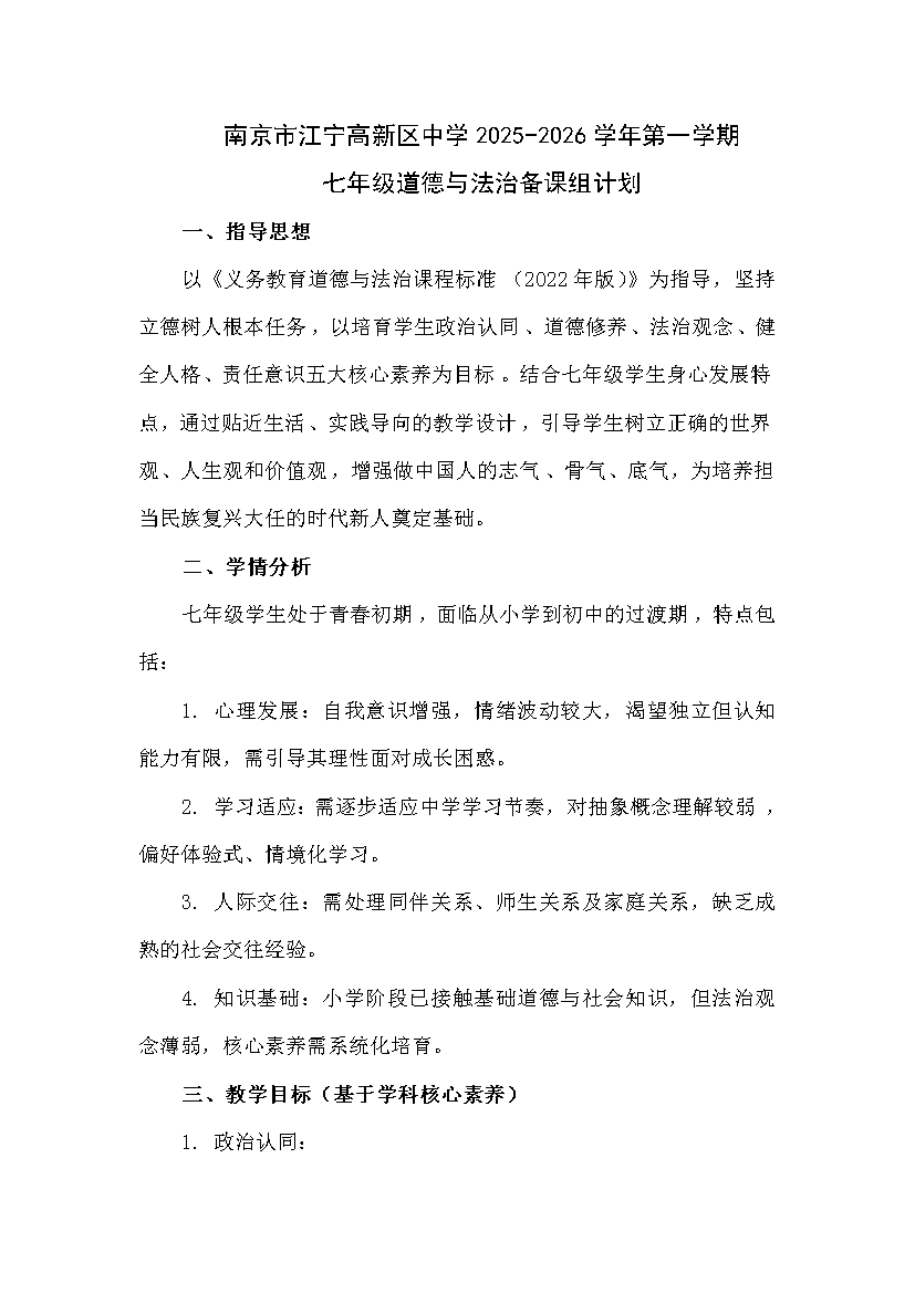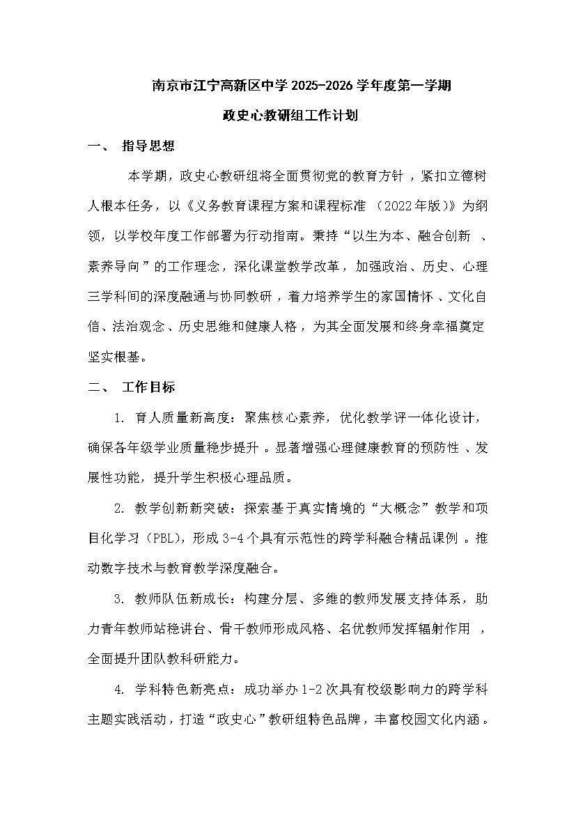 南京市江宁高新区中学2025-2026学年度第一学期政史心教研组、备课组工作计划