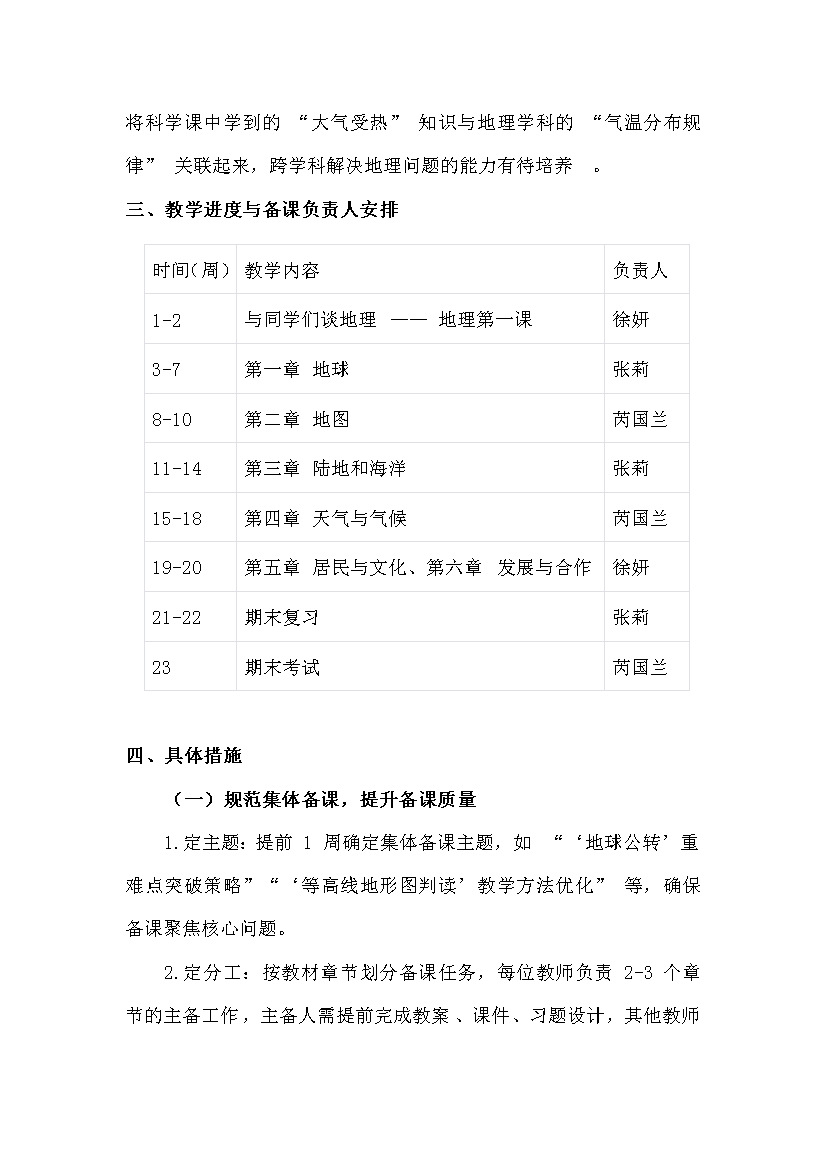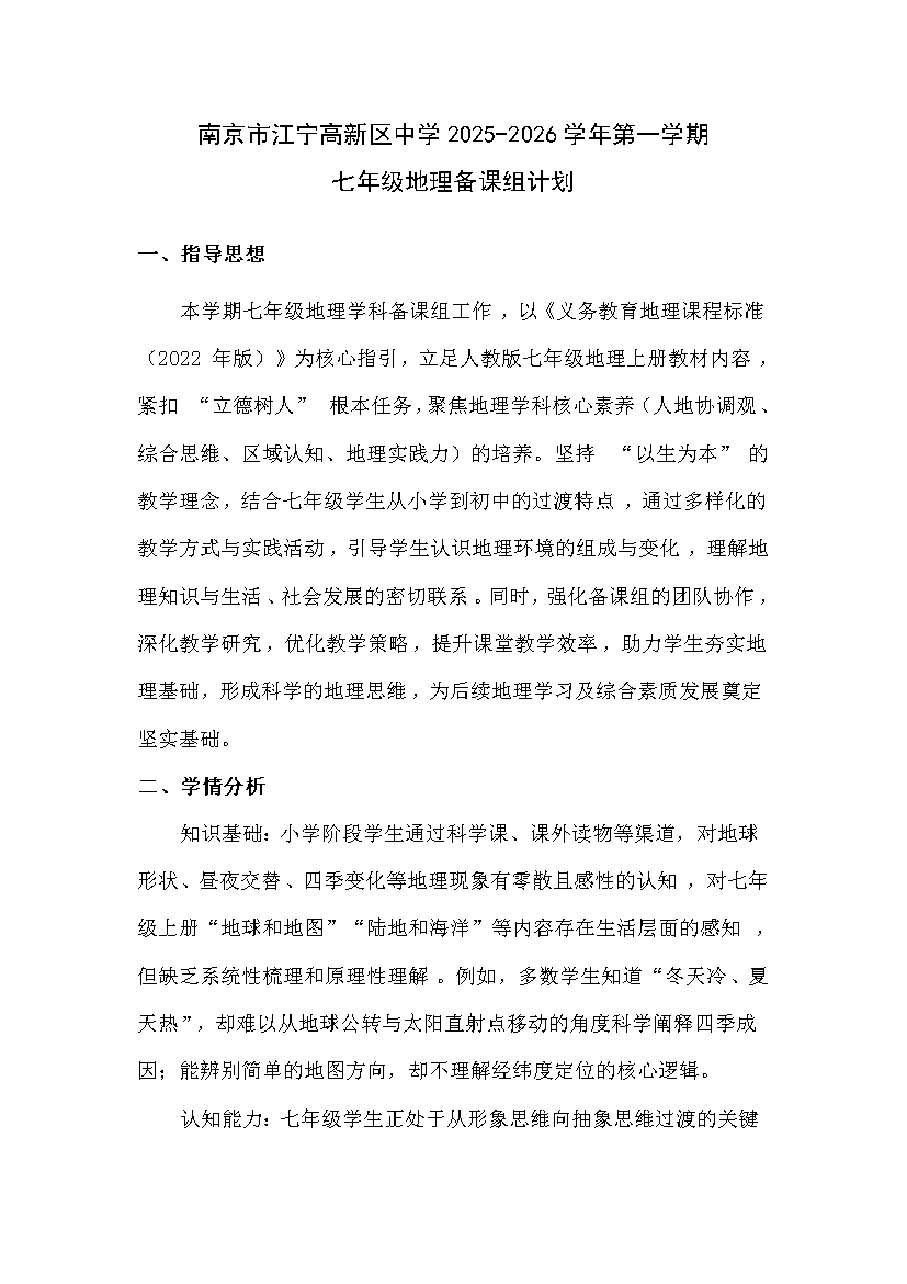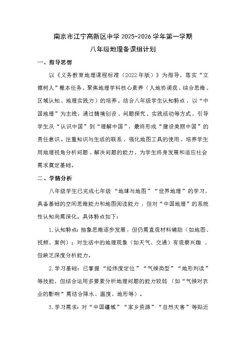 南京市江宁高新区中学2025-2026学年度第一学期地理教研组、备课组工作计划