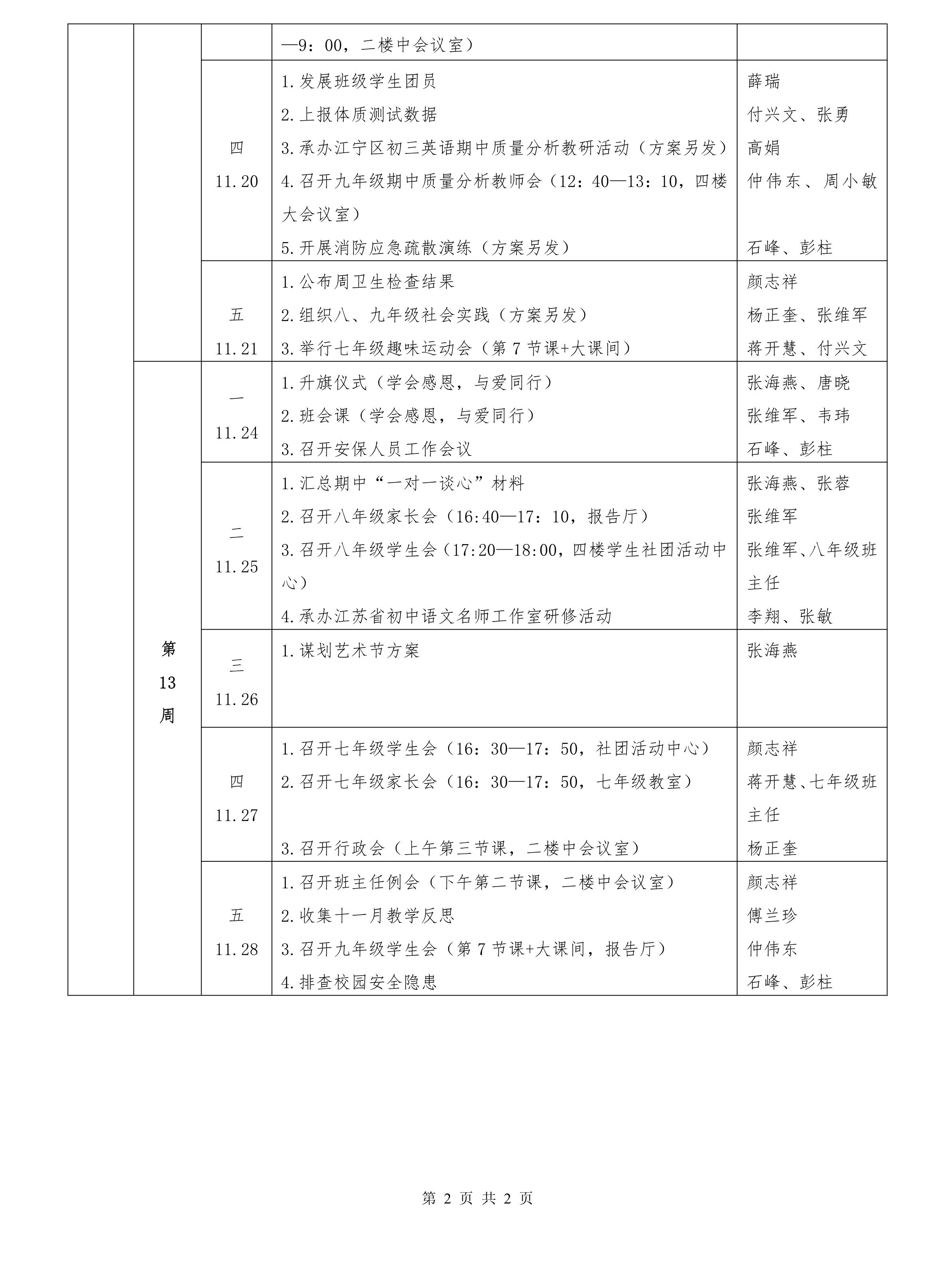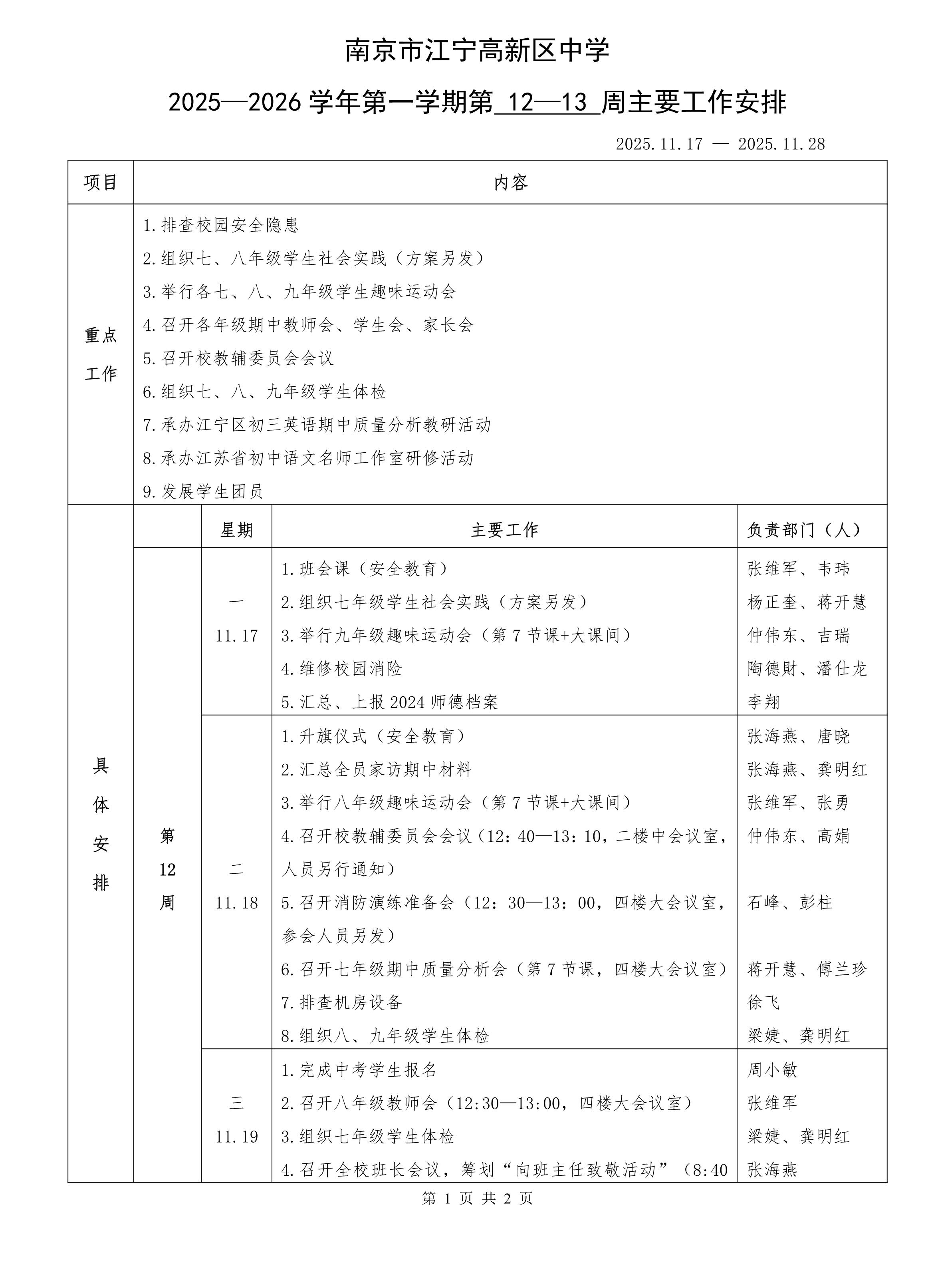 南京市江宁高新区中学2025—2026学年第一学期第12—13周主要工作安排