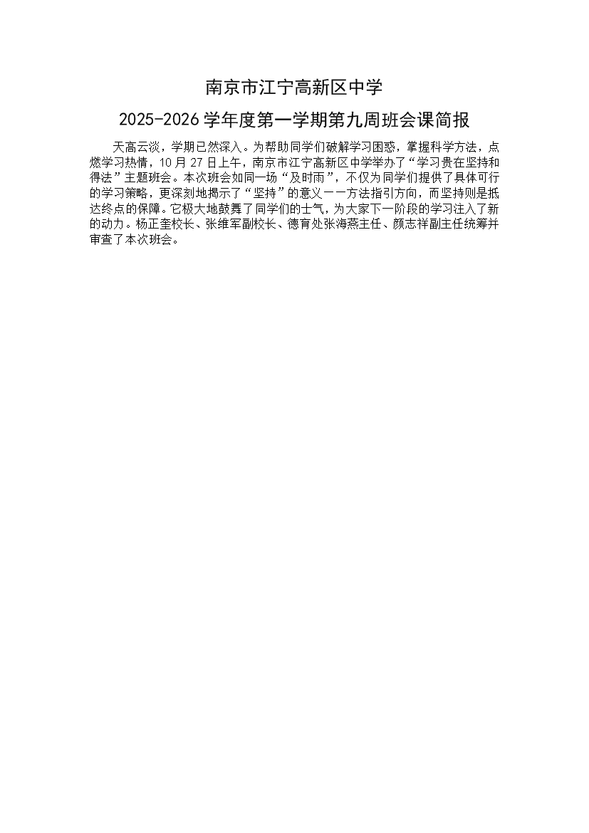 南京市江宁高新区中学2025-2026学年第一学期第9周班会课简报