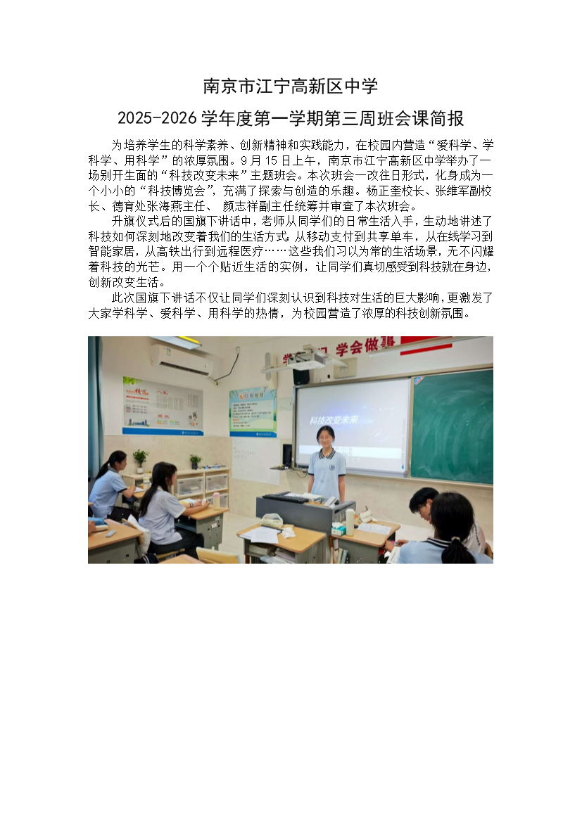南京市江宁高新区中学2025-2026学年第一学期第3周班会课简报
