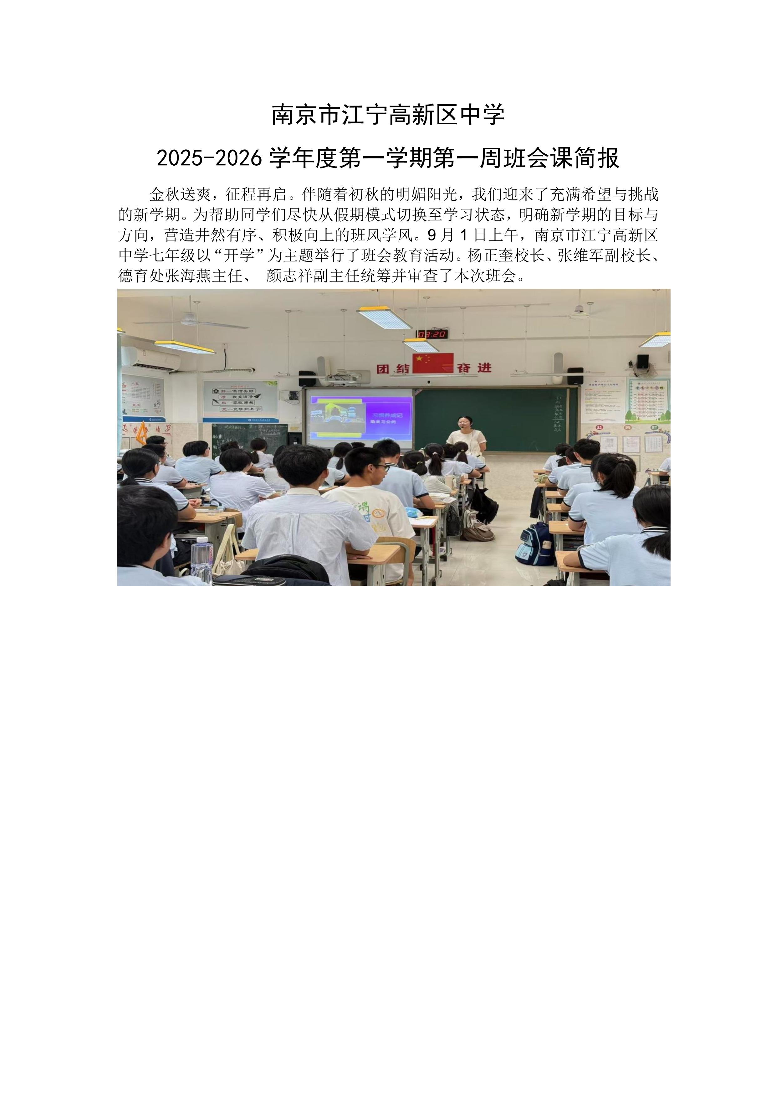 南京市江宁高新区中学2025-2026学年第一学期第1周班会课简报